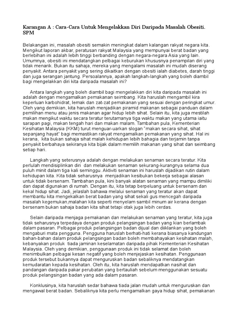 Contoh Karangan B Spm Bahasa Melayu Bagi Langkah Mencegah Obesti